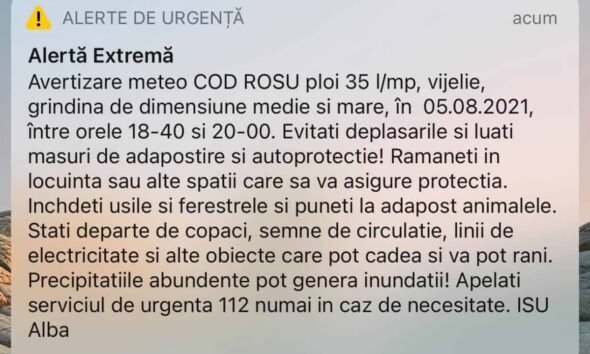 ISU Alba a transmis joi seara mesaje Ro-Alert pentru cetățenii aflați în localitățile din județ vizate de avertizarea meteorologică COD ROȘU de vijelii puternice, grindină, descărcări electrice și averse torențiale....