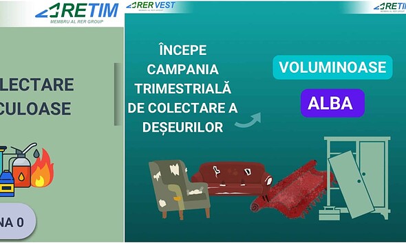 Asocierea RER Vest - RETIM Ecologic Service informează clienţii că, pe perioada sărbătorilor de iarnă, programul de colectare a deșeurilor rămâne neschimbat. Atât în Zona...