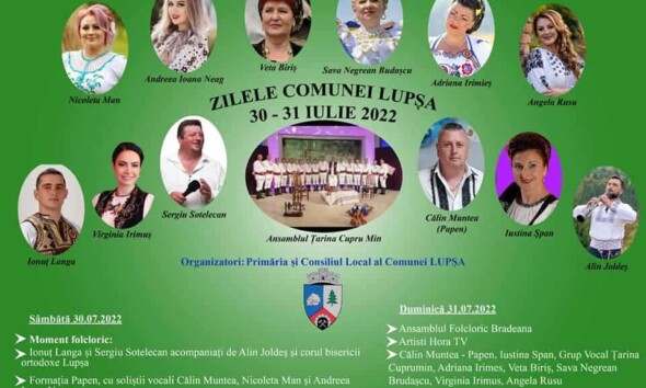 Zile de sărbătoare la sfârșitul lunii iulie, în Țara Moților. În weekend-ul 30 - 31 iulie, localnicii și turiștii sunt invitați la Zilele comunei Lupșa. Din program nu vor lipsi...