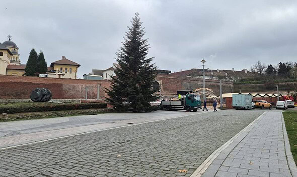 VIDEO: Bradul de Crăciun a ajuns în Șanțurile Cetății Alba Carolina, în zona târgului de iarnă