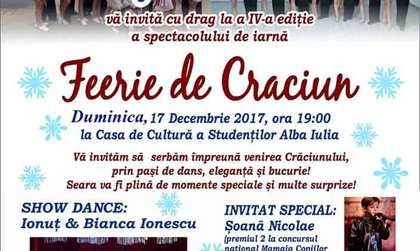 Duminică, 17 decembrie, sunteţi invitaţi la spectacolul “Feerie de Crăciun”, a IV-a ediţie. Atmosfera poveştilor de Crăciun va fi adusă din nou pe scena Casei de Cultură a Studenţilor din...