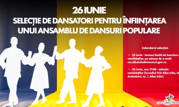 Casa de Cultură a Studenţilor din Alba Iulia organizează o selecție de dansatori, cu vârsta cuprinsă între 16 şi 35 de ani și minimum 1,68 m înălțime, care sunt talentați...