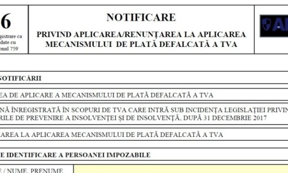 Ordinul preşedintelui ANAF, nr. 223/2018, ce prevede modificarea Formularului 086 - Notificare privind aplicarea/ renunțarea la aplicarea mecanismului de plată defalcată a TVA a fost publicat în Monitorul Oficial şi...