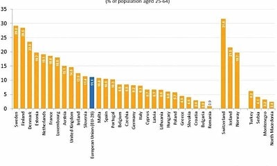 Uniunea Europeană avea în 2018 un număr total de 17,2 milioane de oameni de ştiinţă şi ingineri cu vârsta cuprinsă între 25 şi 64 de...