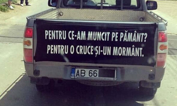 O firmă de pompe funebre din Blaj și-a făcut remarcată prezența printr-un mesaj halucinant. Pe spatele portbagajului dricului cu care firma își desfășoară activitatea stă scris sloganul: "Pentru ce-am muncit...