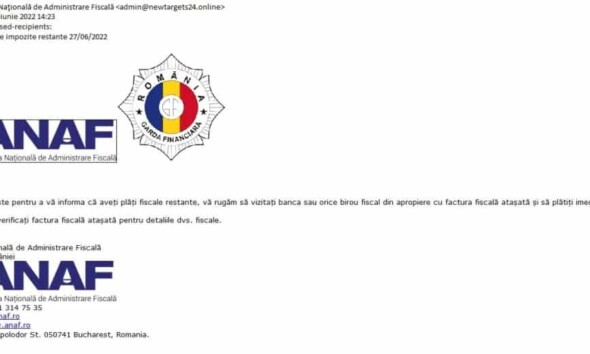 Agenția Națională de Administrare Fiscală (ANAF) avertizează că în ultima perioadă au fost semnalate mesaje fase transmise în numele acesteia. Este vorba despre emailuri false. ANAF avertizează persoanele care primesc...
