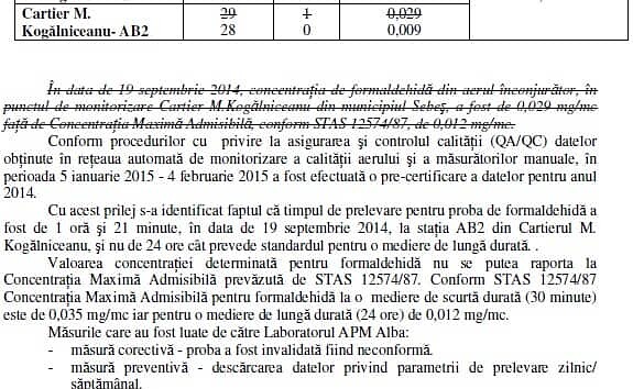 Agenția pentru Protecția Mediului Alba a modificat joi, 5 februarie, raportul privind starea mediului pentru luna septembrie 2014, în care concentrația maximă de formaldehidă înregistrată era de 0,029 mg/mc (concentrația...