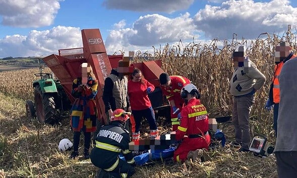 FOTO: Bărbat rănit după ce și-a prins o mână la un utilaj de cules porumb, într-o comună din Alba. A fost chemat elicopterul SMURD