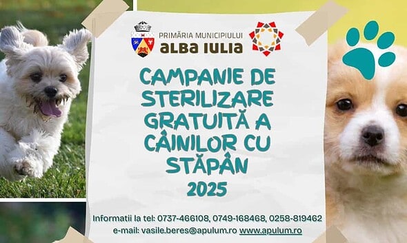 Campanie gratuită de sterilizare a câinilor cu stăpân, la Alba Iulia: microcipare, RECS și carnet de sănătate. Primăria Municipiului Alba Iulia organizează o campanie de sterilizare gratuită a câinilor cu...