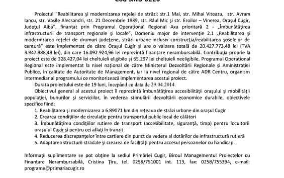 Primăria Cugir implementează un proiect de reabilitare şi modernizare a şapte străzi din zona Cugir-Vinerea, cofinanţat prin Programul Operaţional Regional. Valoarea totală a acestuia este de 20,42 milioane lei, iar...