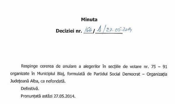 În urma sesizării PSD Alba privind incorectitudinea rezultatelor alegerilor europarlamentare la Blaj, Biroul Electoral Central a respins ca nefondată acuzația. Primarul Blajului, Gheorghe Valentin Rotar a ținut să facă precizări...
