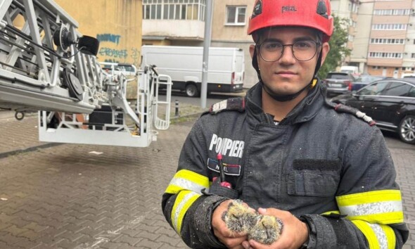 FOTO: Pui de porumbel, salvați de pompierii din Alba Iulia care au intervenit, după furtună, la fațada unui bloc