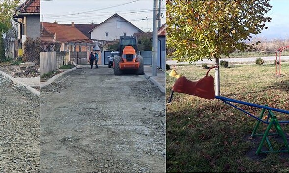 FOTO: Lucrări în Teiuș. Se așterne stratul de piatră pe o stradă din oraș. Trei obiecte de joacă, montate într-o zonă de picnic