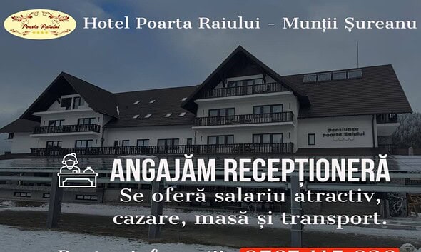 Hotelul Poarta Raiului - Munții Șureanu angajează recepționeră. Se oferă salariu atractiv, cazare, masă și transport. Informații suplimentare se pot obține la telefon 0767.115.826. Hotelul este situat într-una dintre cele...