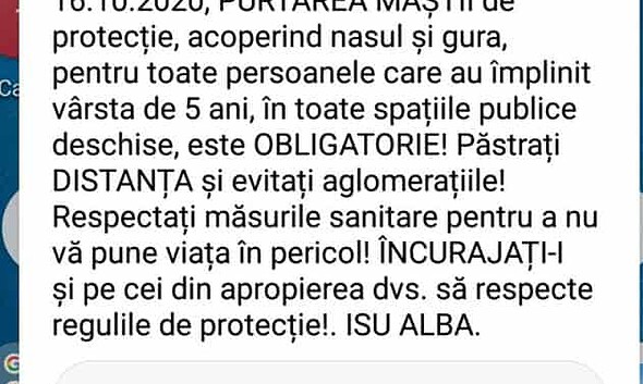 O alertă de tipul ”RO Alert” a fost trimisă pe telefoanele mobile locuitorilor din județul Alba, în contextul numărului mare de cazuri de coronavirus înregistrate...