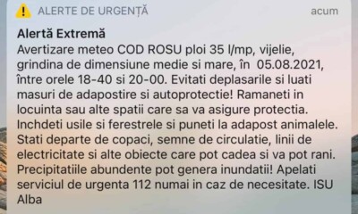 Locuitorii din județul Alba au primit marți dimineață o alertă pe telefoanele mobile prin sistemul...