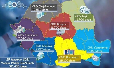 Luni, 25 ianuarie, va sosi în România a șasea tranșă de vaccin de la Pfizer...