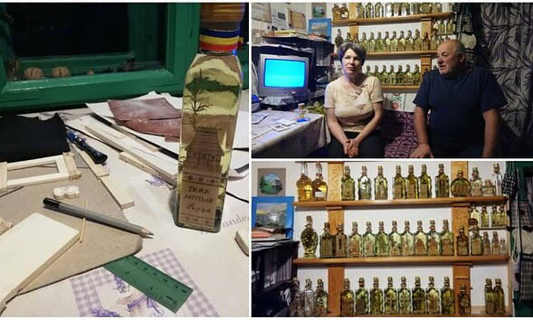 VIDEO: Istorie și artizanat în pălincă. Arta lemnului în sticlă, făcută cu pasiune de o familie dintr-un sat izolat din Apuseni