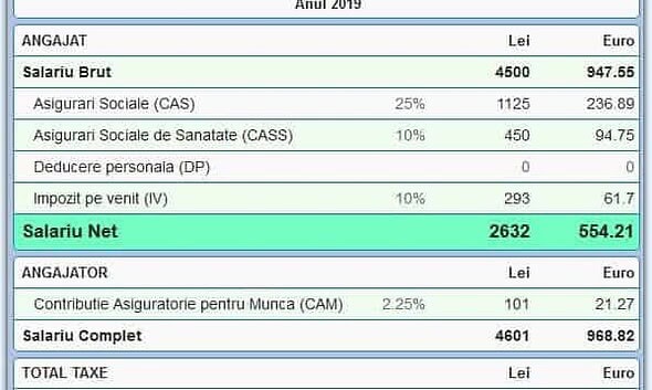 Dintr-un salariu brut de 4.500 de lei, un angajat din România primește „în mână” puțin peste 2.600 de lei, restul, respectiv 1.969 de lei (42,8%), reprezintă impozite către stat. Taxele...