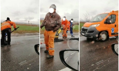 Mai mulți muncitori au fost surprinși, joi, în timp ce plombau, pe ploaie, gropile din...