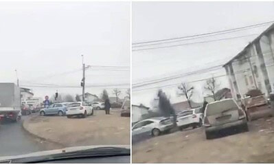 Un șofer care se afla cu autoturismul în coloană, la ieșirea din parcarea unui supermarket...