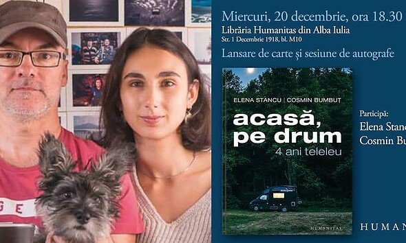 Echipa de la teleleu.eu, Elena Stancu și Cosmin Bumbuț își lansează, miercuri, 20 decembrie, de la ora 18:30, la Librăria Humanitas din Alba Iulia, cartea lor „Acasă, pe drum. 4...