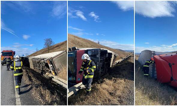 FOTO-VIDEO: TIR încărcat cu tablă, răsturnat pe breteaua de ieșire de pe autostrada A1, la Cunța