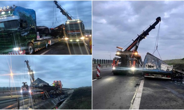 Remorca autocamionului care a ars pe Autostrada A1 Sebeș - Sibiu, în zona Cunța, a fost ridicată duminică seara de pe banda de urgență. Astfel, începând cu ora 21:20, circulația...