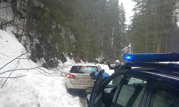Doi turiști din Cluj, care au rămas blocați cu mașina în zăpadă, pe un drum...