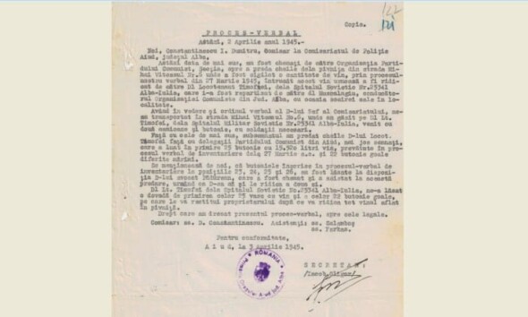 Arhivele Alba au publicat un document (proces-verbal al Poliției Aiud), datat 2 aprilie 1945, în care se descrie cum a fost predat vinul confiscat de la locuitorii sași, către Armata...