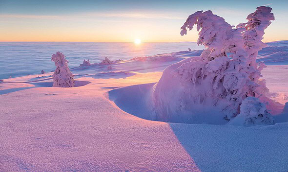 FOTO: Imagini de poveste de pe crestele Munților Apuseni. Răsărit de soare cu brazi încărcați de zăpadă