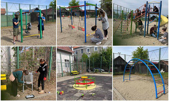 FOTO Lecție de simț civic și implicare, la Uioara de Sus: un grup de tineri au vopsit elementele ce compun un loc de joacă