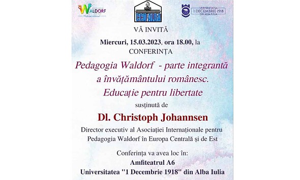 Asociația Waldorf Alba Iulia organizează miercuri, 15 martie, Conferința „Pedagogia Waldorf - parte integrantă a învățământului românesc. Educație pentru libertate”. Invitat special este Christoph Johannsen, director executiv al IAO (Asociația...