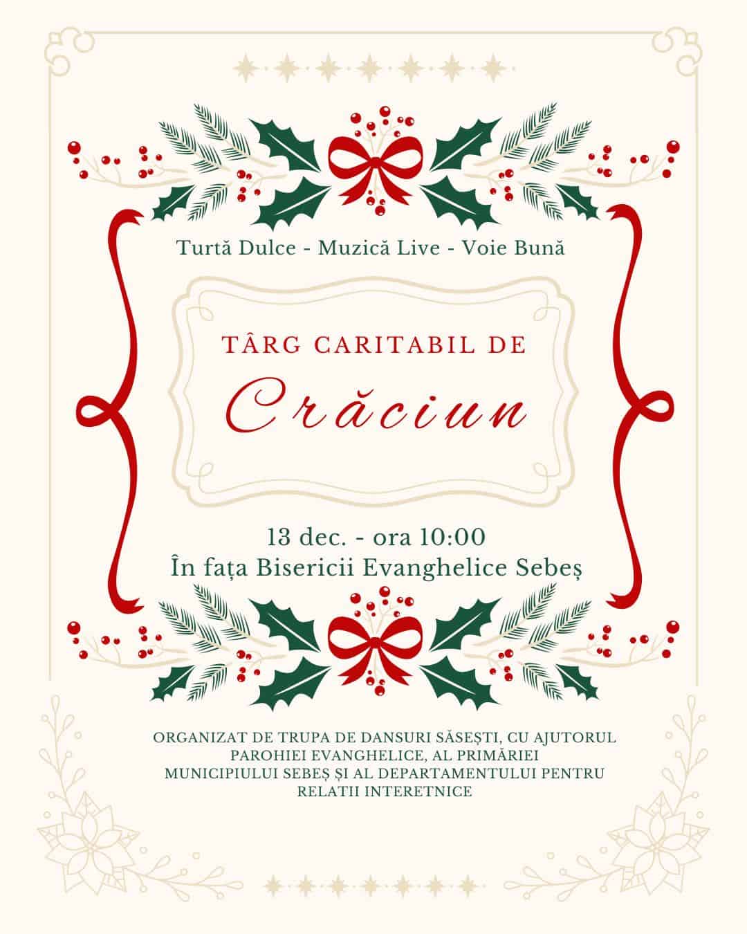 Un Târg Caritabil de Crăciun va avea loc sâmbătă, 13 decembrie, în fața Bisericii Evanghelice din Sebeș, de la ora 10:00.
