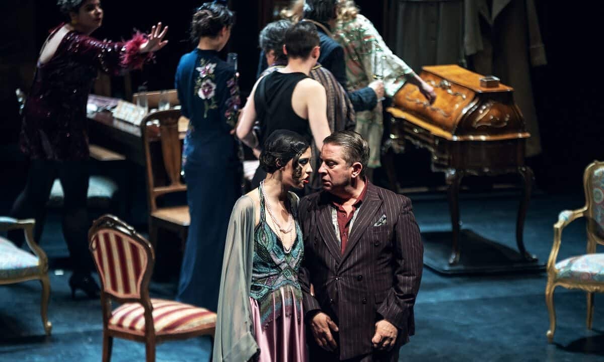 O scenografie clasică, cu un decor care acoperă toată scena. Atunci când crezi că piesele de mobilier pe scenă s-au învechit și că aparțin unei epoci apuse a teatrului, te poți înșela amarnic.