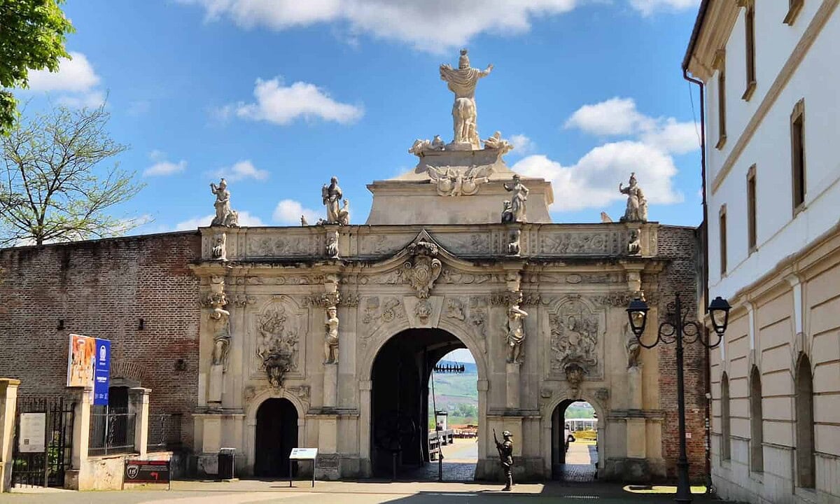 Lecția de istorie continuă, iar în cateva momente turiștii vor vedea Poarta a II-a a Cetății Alba Carolina. Aceasta dezvoltă patru stâlpi fără arce, dintre care stâlpii centrali, deosebiți ca formă arhitecturală şi stilistică, dezvoltă coloane cu atlanți ce susțin simboluri ale imperiului austriac.