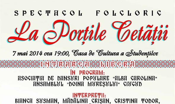 O seară cu muzică și dansuri populare îi așteaptă pe albaiulieni miercuri, 7 mai, la Casa de Cultură a Studenților Alba Iulia. Este vorba de Spectacolul Folcloric „La Porțile Cetății”,...