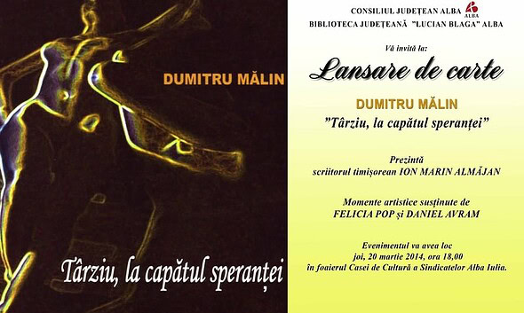 Poetul Dumitru Mălin îşi lansează cel mai nou volum de versuri, intitulat „Târziu, la capătul speranţei”. Cu această ocazie, cei prezenţi vor avea ocazia să asculte şi un recital de...