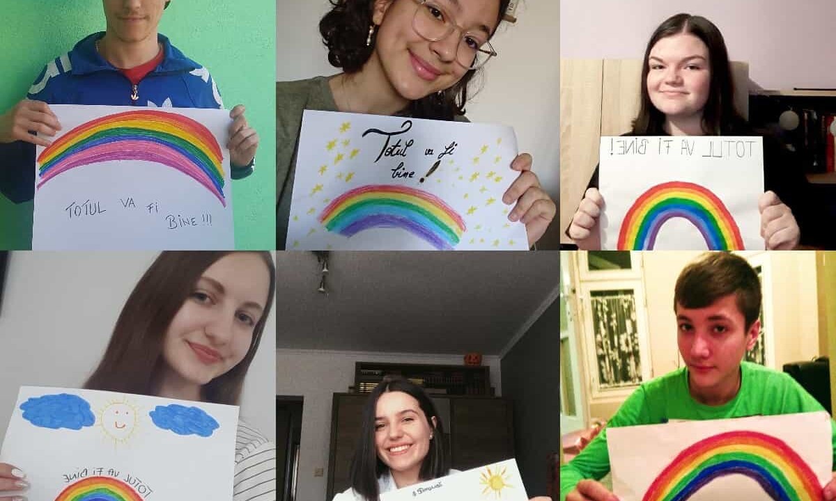 Tinerii din Consiliul Județean al Elevilor au desenat câte un curcubeu pe o coală de hartie, ca simbol al unui strop de culoare într-o perioadă ”gri.”