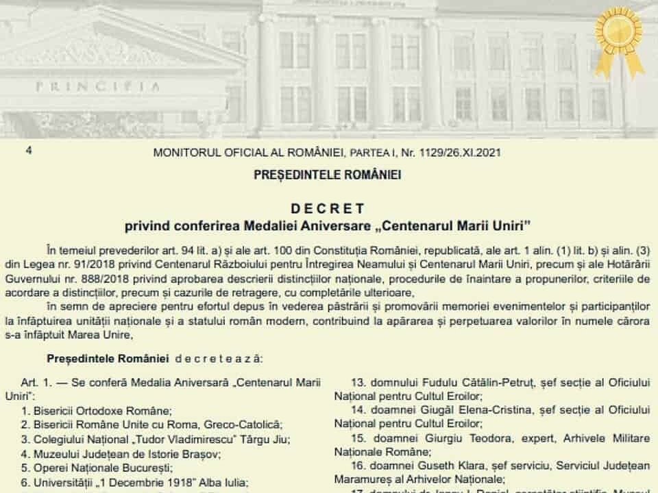 Universitatea „1 Decembrie 1918” din Alba Iulia a primit, prin decretul semnat de Președintele României, Klaus Iohannis, Medalia Aniversară „Centenarul Marii Uniri”, în semn de apreciere pentru „efortul depus în vederea păstrării și promovării memoriei evenimentelor și participanților la înfăptuirea unității naționale și a statului român modern, contribuind la apărarea și perpetuarea valorilor în numele cărora s-a înfăptuit Marea Unire”, a anunțat sâmbătă rectorul Daniel Breaz.