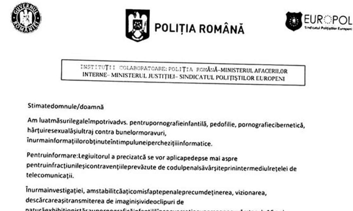 Alte mesaje primite pe e-mail arată așa: "Bună ziua, ca urmare a activităților dvs. prin intermediul conexiunii dvs. la internet, poliția noastră cibernetică a detectat mai multe infracțiuni privind fluxul dvs. de date, care sunt sancționate imediat printr-o plângere în conformitate cu Codul penal, în cadrul represiunii împotriva criminalității cibernetice. Vă rugăm să luați act de citația atașată și să ne contactați cât mai curând posibil, altfel vom fi nevoiți să vă arestăm. Cu sinceritate, FLORIN MARASCU, INSPECTORUL GENERAL AL POLIȚIEI. Brigada pentru protecția minorilor - EUROPOL"