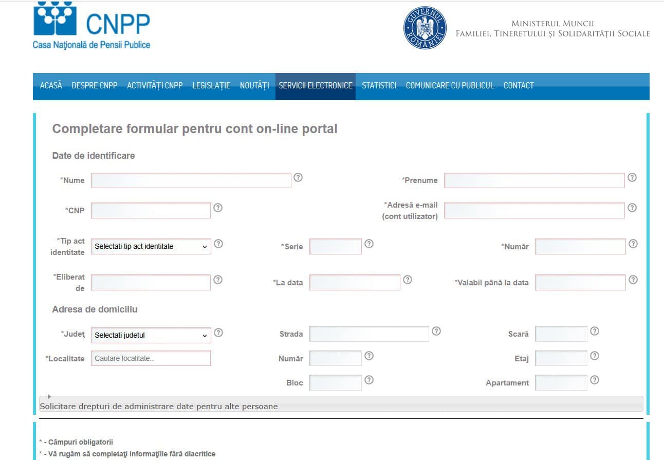 Se completează datele cerute. Cererea va fi procesată și va fi transmisă, pe adresa de e-mail comunicată, confirmarea creării contului și instrucțiuni pentru setarea parolei.