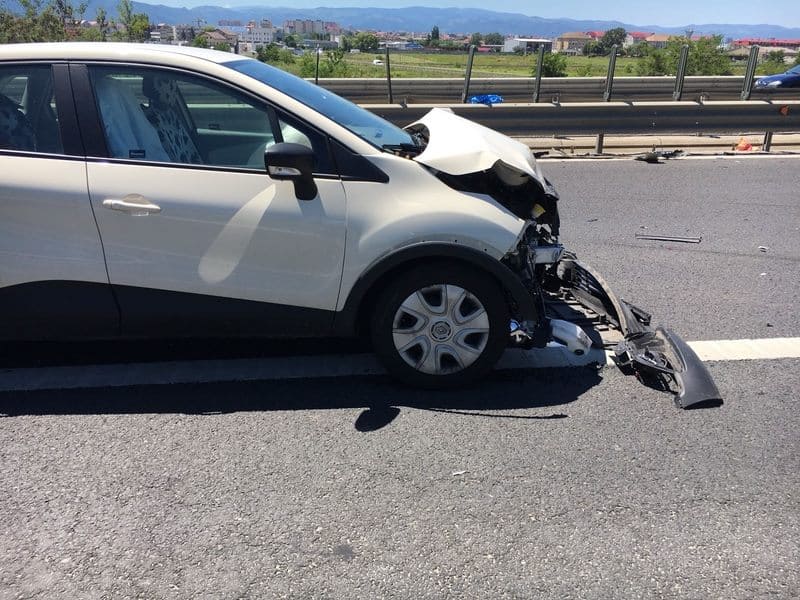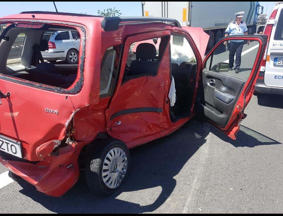 UPDATE: Din primele cercetări, o conducătoare auto a întors neregulamentar autoturismul, maşina fiind lovită de alte două autovehicule, care circulau regulamentar pe banda unu, respectiv banda doi de mers.