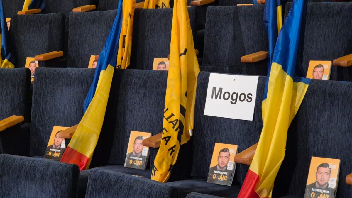 Pe lângă chipul lui George Simion, lângă fiecare scaun au fost așezate steaguri, unul cu AUR, iar altul cu România. La eveniment, participă fizic și președintele AUR, George Simion.
