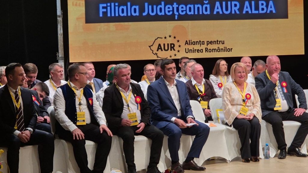 Alegeri interne în interiorul AUR Alba. Vineri, 31 octombrie 2025, sala Casei de Cultură a Sindicatelor din Alba Iulia a fost îmbrăcată strident în ”hainele AUR”. Pe fiecare scaun al sălii se afla așezat chipul președintelului la nivel național, George Simion.
