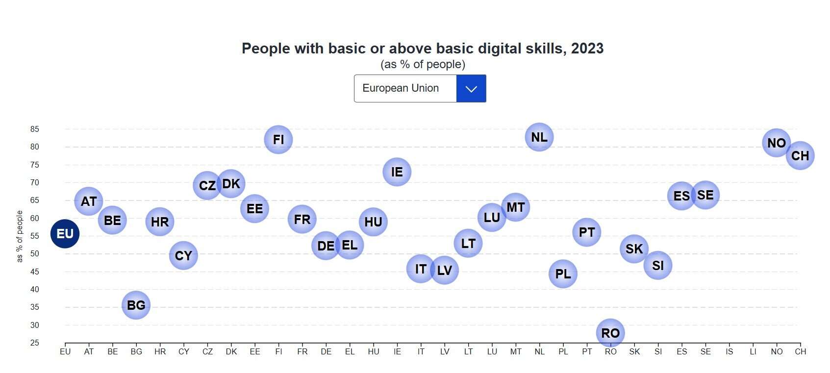 În țările UE, ponderea persoanelor cu competențe digitale de bază sau superioare nivelului de bază în 2023 a fost cea mai mare în Olanda (83%) și Finlanda (82%), înaintea Irlandei (73%), Danemarcei (70%) și Cehiei (69%).