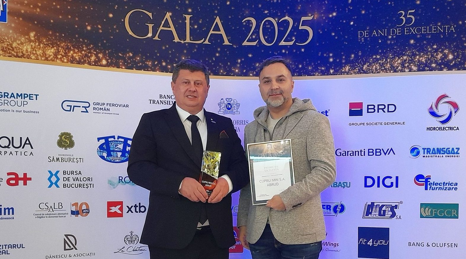 Directorul general Cupru Min, Mircea Goia și Bogdan Chițescu, membru CA Cupru Min au recepționat trofeul, la Gala aniversară de 35 de ani a ziarului Bursa.