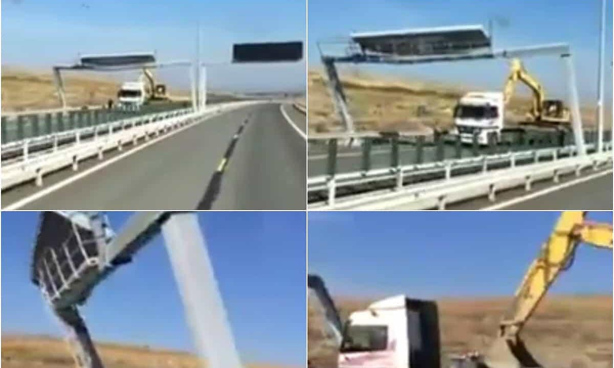 O situație demnă de cascadorii râsului a fost surprinsă de un participant la trafic, pe autostrada Sibiu - Orăștie. Acesta a postat pe rețeaua de socializare Facebook un video în care se poate observa cum șoferul unui camion ce transporta un excavator a lovit cu braţul utilajului un panou de semnalizare auto de pe autostradă și l-a deteriorat.