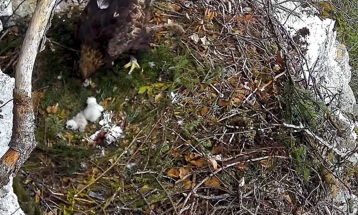 Camera montată în apropierea unui cuib de acvilă de munte din Parcul Natural Apuseni a surprins un moment foarte rar: eclozarea a doi pui.