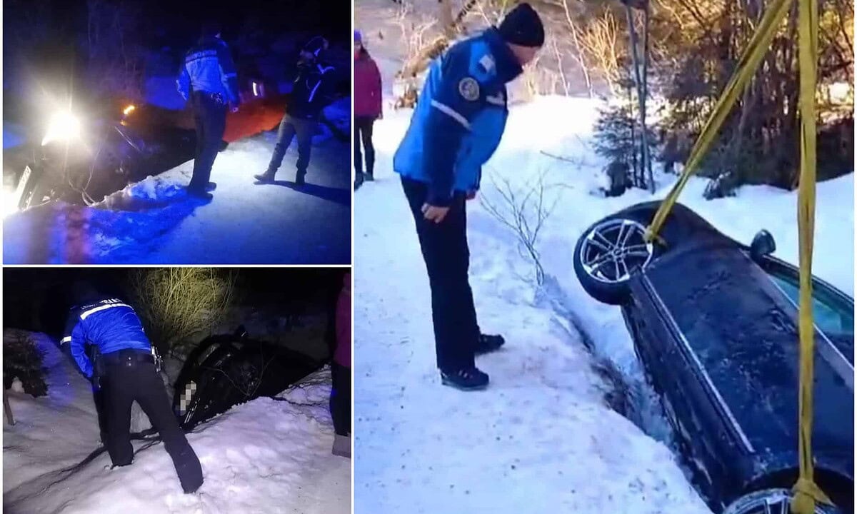VIDEO: Familie aflată în drum spre o pensiune din zona Șureanu, ajutată de jandarmi. Autoturismul lor a derapat într-un șanț